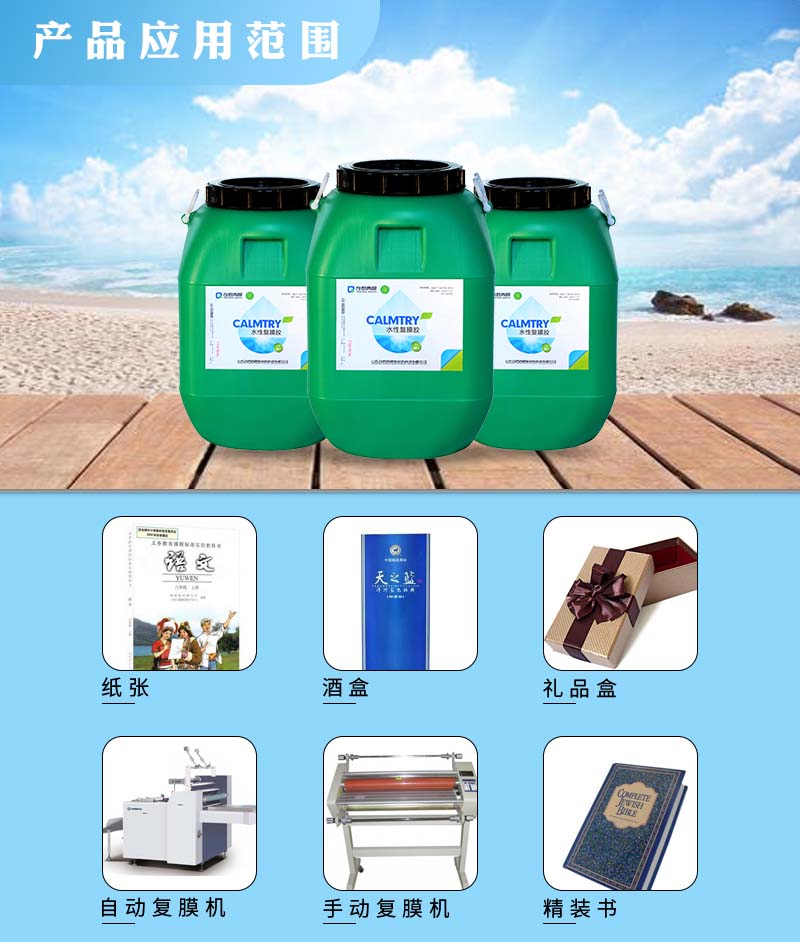 ? ?用于紙張與BOPP膜、PET膜等塑料薄膜的粘合,印刷包裝行業禮品盒、紙箱、酒盒、酒箱、手提袋等高中低檔紙質盒子、箱子,復合產品干燥時間趕,忠于原色,無色相飄逸。